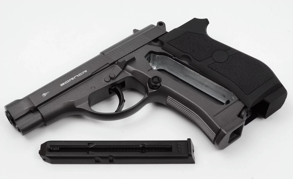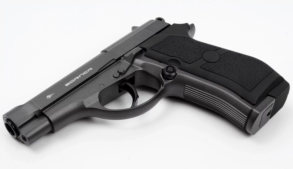 На перший погляд незвичайна форма рукояти пістолета Borner M84 (Beretta) може знищити, але це до моменту взяття зброї в руки. Неймовірне зручність використання перевершує всі початкові сомнення, палец автоматично і органічно лягає на крючок спуска. На рукоятці з лицевою і тильною сторонами є нарізні декоративні вставки, що дозволяють утримувати зброю ще більш надійно. Весит Борнер М84/2 730 гр. Невисока маса моделі не знижує міцність зброї - основним матеріалом для виготовлення корпусу пістолета є металевий сплав. Комфорт в процесі стрільби робить дану модель широко популярною у новичків і професіоналів.