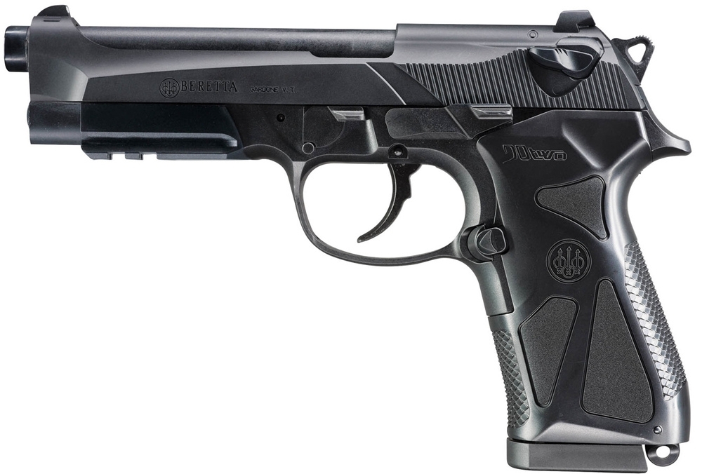 Страйкбольна версія Beretta 90 Two повністю повторює оригінал та має автентичне маркування, оскільки продукція Umarex ліцензована компанією Beretta. Корпус та рамка репліки виготовлені із полімерних матеріалів, а ствол та деякі внутрішні елементи - зі сталі. Модель має ергономічне текстуроване руків`я, завдяки якому забезпечується зручне тримання зброї при стрільбі. Подібно до оригіналу, репліка оснащена підствольною планкою Пікатінні, яка прихована за знімною захисною панеллю та дозволяє встановити додаткові аксесуари, такі як підствольні ліхтарі та лазерні цілевказівники. Спускова скоба збільшена, завдяки чому забезпечується можливість ведення стрільби в тактичних рукавичках. Як прицільні пристосування використані механічні цілик і мушка, з нанесеними на них білими точками для кращого прицілювання в темну пору доби. Модель також має різьбу під дульні пристрої. В лівій стороні кожуха-затвора розташований ручний запобіжник, а для швидкої заміни магазина на руків`ї передбачена кнопка скидання. Наявність спеціальних ребристих насічок на кожуху-затворі спрощує перезаряджання зброї за будь-яких умов. Ще однією конструктивною особливістю Beretta 90 Two є згладжені кути, завдяки яким прискорюється виймання зброї із кобури.