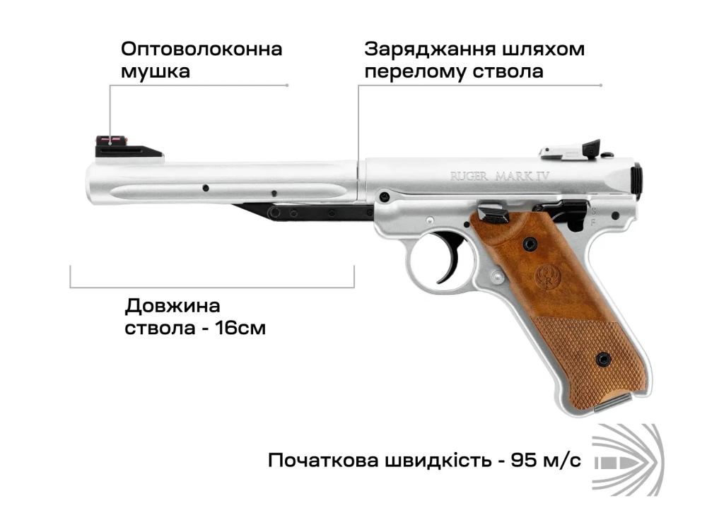 Umarex Ruger Mark IV Stainless - це пружинно-поршневий пістолет, що забезпечує йому універсальність і відсутність необхідності в змінних джерелах живлення (балон СО2). Цей пістолет ідеально підходить для тих, хто хоче насолоджуватися стрільбою без зайвого клопоту.