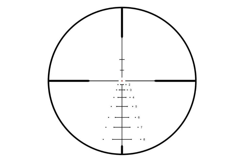 Точні барабани внесення поправок (Target Style Turrets) з кроком 1/4 МОА дозволяють швидко налаштувати приціл, а бічний фокус — легко фокусуватись на різних дистанціях. Вигравіювана на склі сітка DOA-LRH800 у другій фокальній площині з підсвічуванням центральної точки спрощує прицілювання й дозволяє враховувати траєкторію кулі та вплив вітру без додаткових налаштувань.