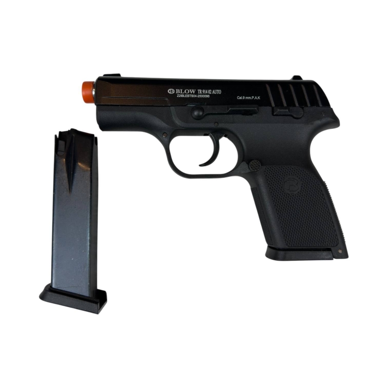 Ruger SR9 - самозарядний пістолет з УСМ подвійної дії, схожим із системою Glock "Safe Action". Він оснащений дворядним магазином при товщині рукоятки лише 30 мм та низькопрофільним затвором. Серед модифікацій Ruger SR9: SR9c, SR40, SR40 compact, SR22. Ергономічний та надійний, із зручною кобурою, Ruger SR9 ідеально підходить для самооборони. BLOW TRZ 914 02 – це його легальна, безпечна, сигнально-шумова копія, що відрізняється високою якістю складання та фарбування.