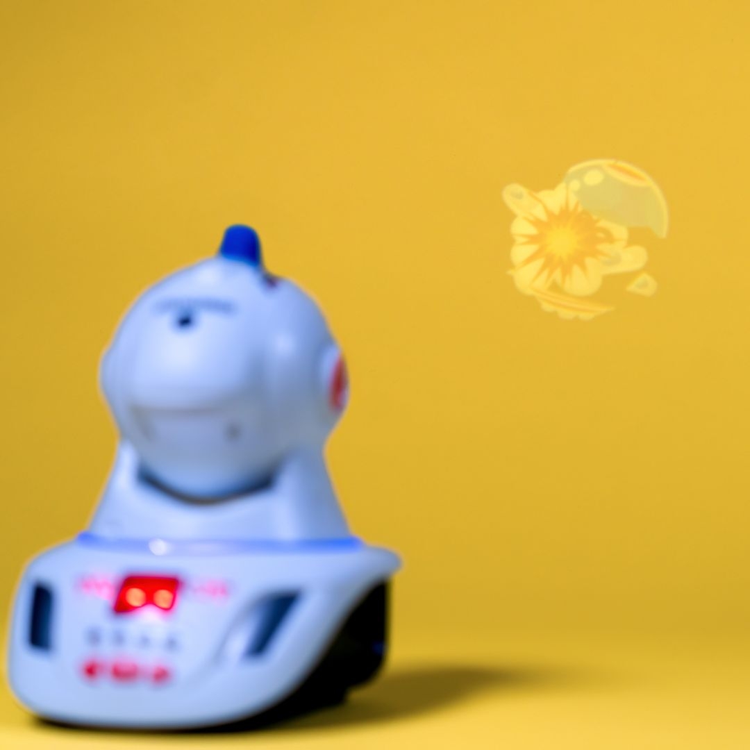 Проектор із 3 картками проектує зображення (літаюча тарілка, динозавр, качка) для тренування точності; можна грати самостійно або командами.