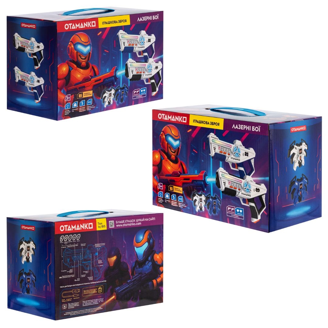 Привіт, друзі! Отаманчик запрошує на справжнє пригода — набір «ЛАЗЕРНІ БОЇ» ТМ OTAMANKO! У комплекті два пістолети та два жилети, тож можна відразу влаштовувати командні бої. Зброя працює на інфрачервоне випромінювання, оснащена світловими та звуковими ефектами та дозволяє обирати 5 режимів стрільби — від пістолета до кулемета. Мета гравців — влучати у жилети суперників, знімаючи їх «життя» до моменту визначення переможця. Ця командна гра дарує море драйву, азарту та веселощів і дітям, і дорослим!