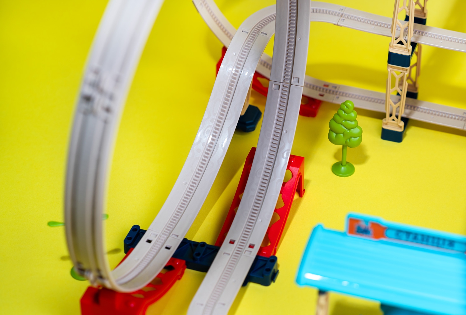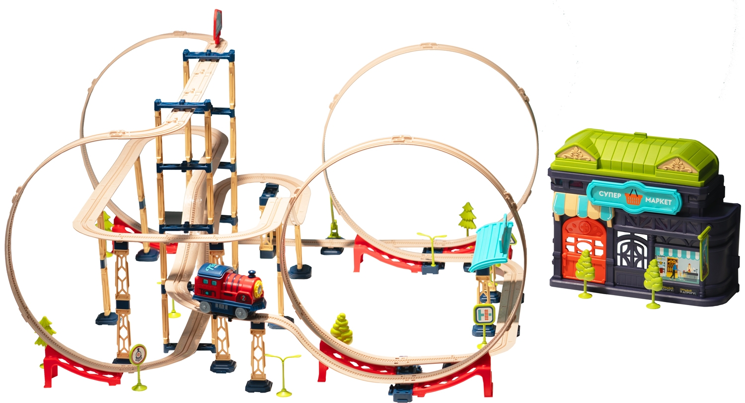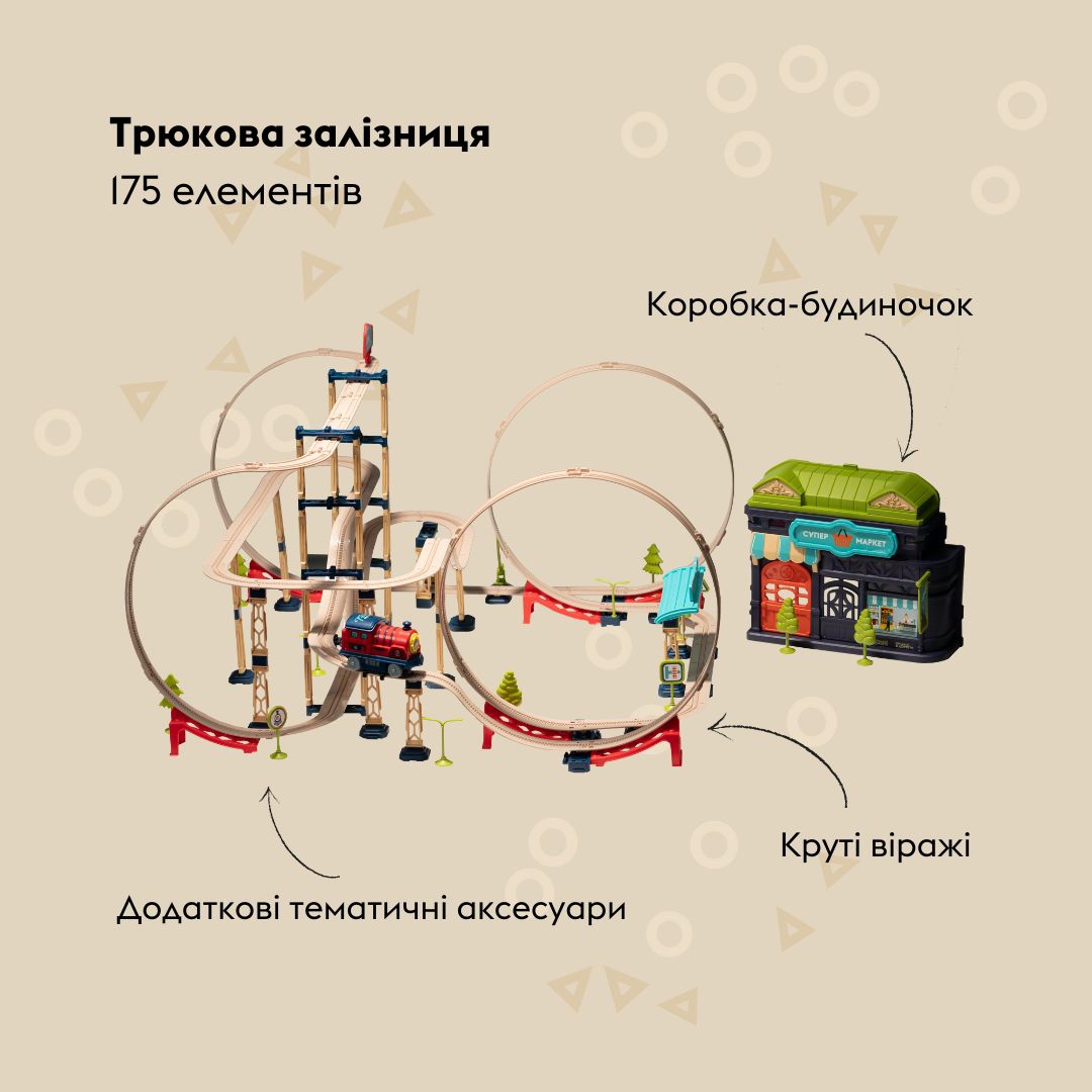 Трюкова залізниця «Хоробрий Паровозик» — інтерактивний ігровий набір для маленьких дослідників! Створюйте траси з крутими спусками, підйомами, «мертвими петлями» та багаторівневими ділянками. Коробка-чемодан зручно зберігає всі елементи і може використовуватися як частина траси, додаючи нові рівні. Кілька наборів можна об’єднувати для масштабних маршрутів.