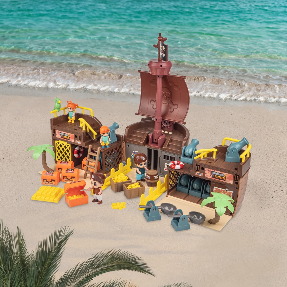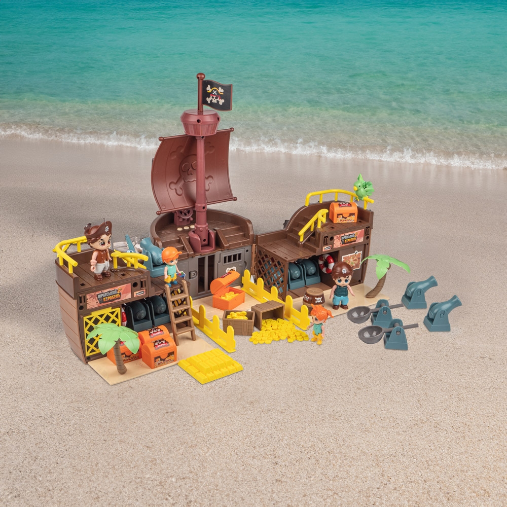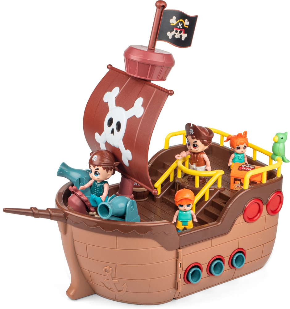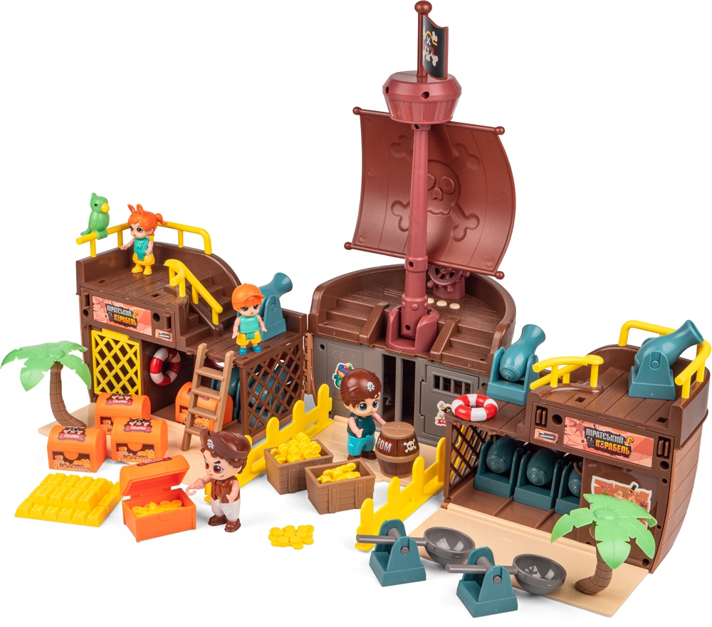 Ігровий набір «Піратський корабель» — ідеальна іграшка для маленьких капітанів! Набір включає 4 піратські фігурки та тематичні аксесуари, які можна зручно зберігати всередині корабля. Звукові ефекти роблять гру більш реалістичною, а вигадування пригод розвиває уяву та соціальні навички дитини.