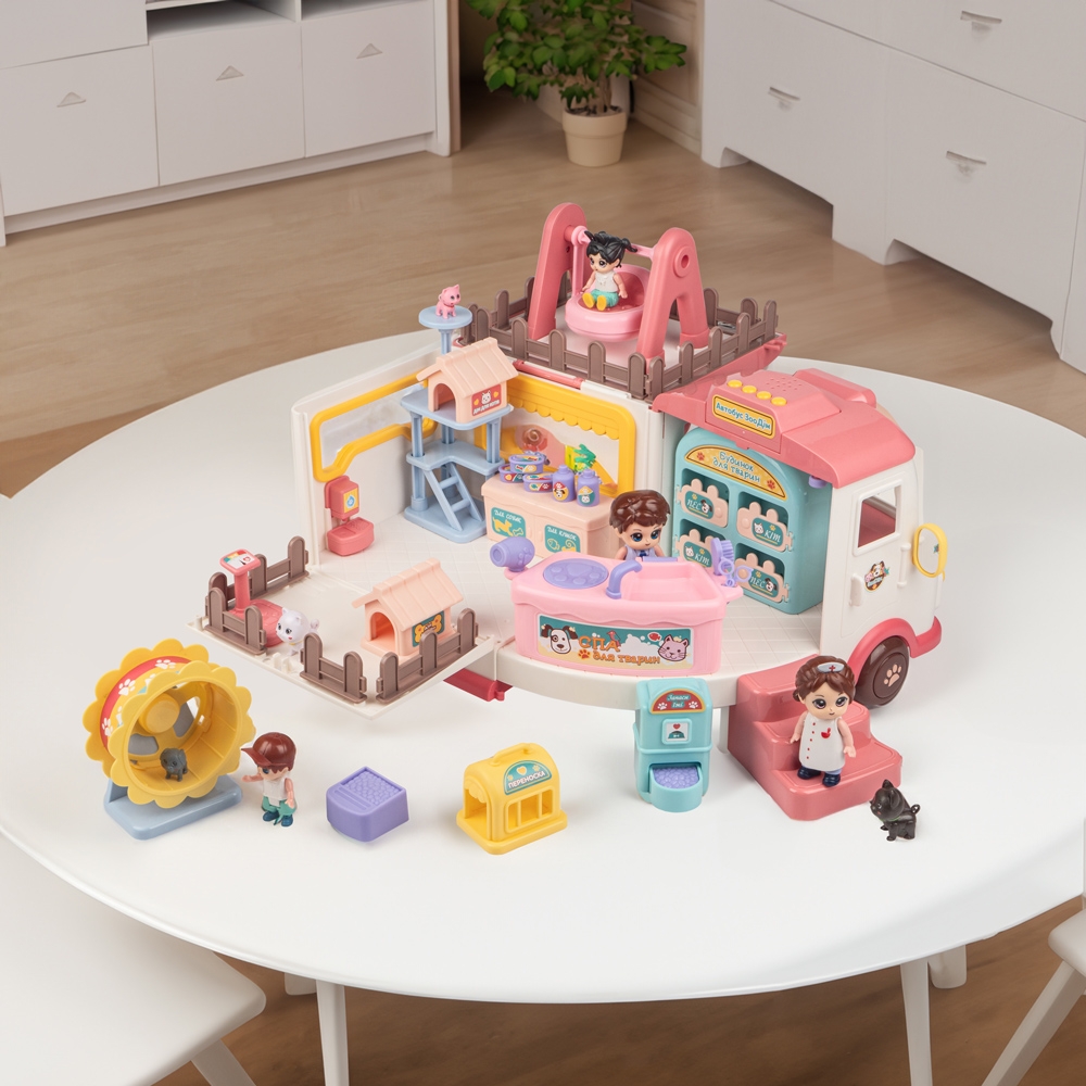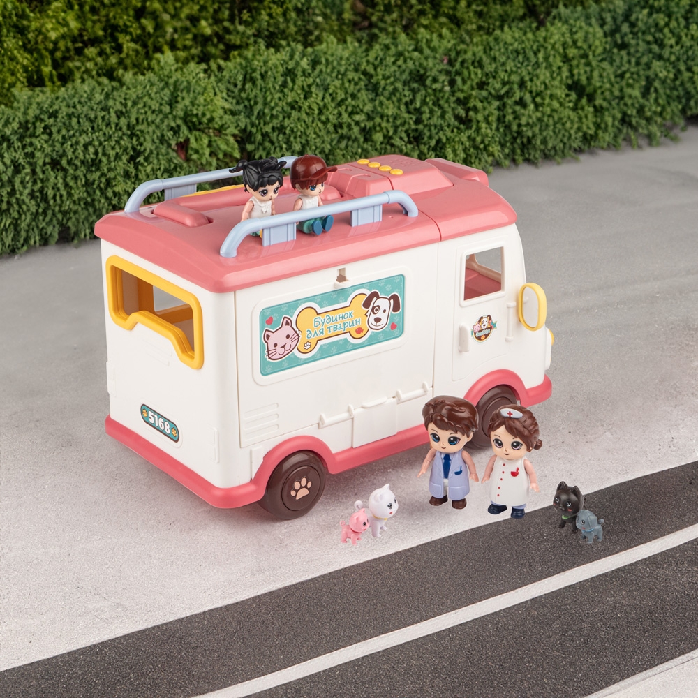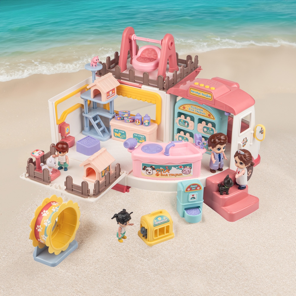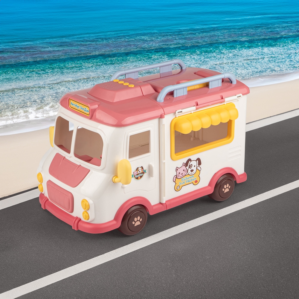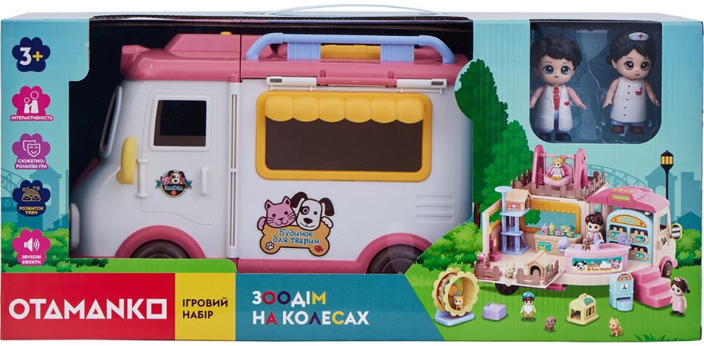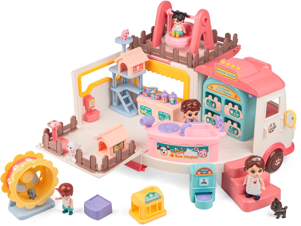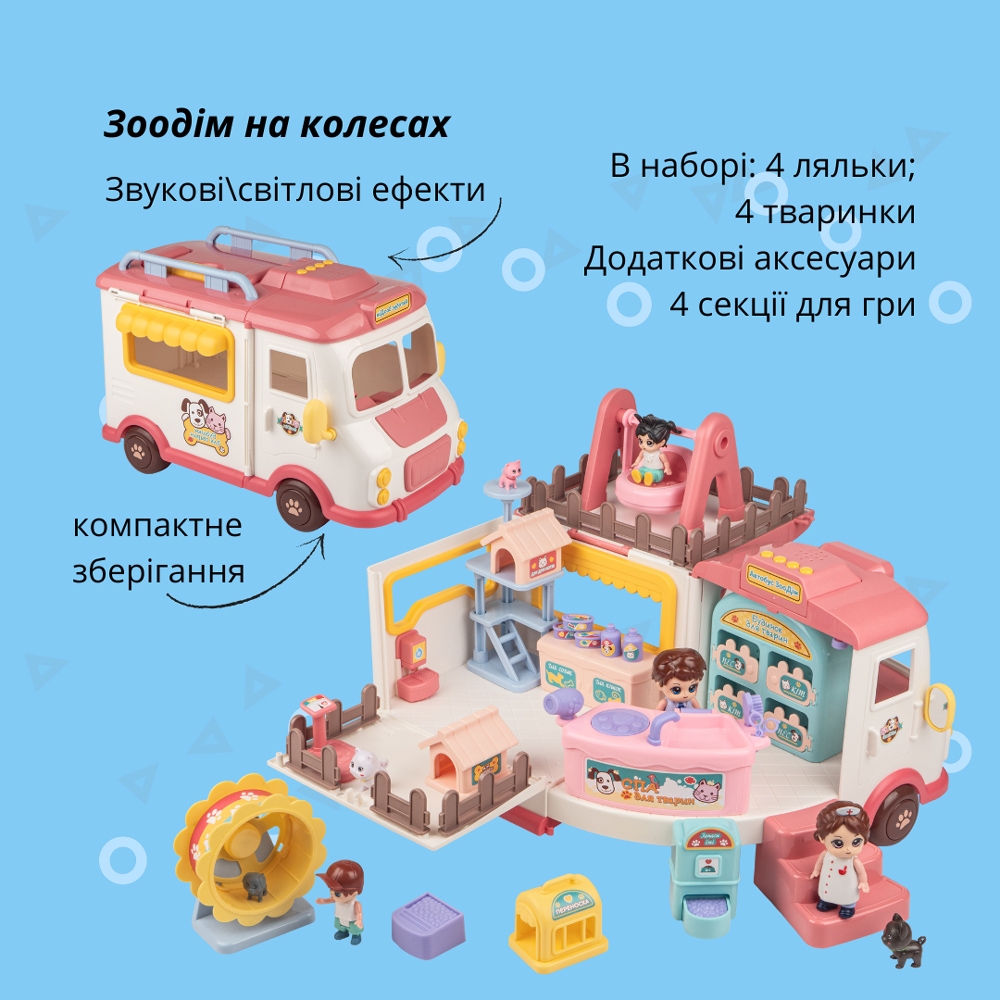Ігровий набір «Зоодім на колесах» — захоплива іграшка для маленьких любителів тварин! Набір включає 4 ігрові зони: зона вигулу та розваг, СПА-зона, бокс для відпочинку та гойдалки. Діти зможуть доглядати за улюбленцями, влаштовувати ігри та відпочинок, а звукові ефекти роблять гру ще більш реалістичною. У комплекті 4 фігурки тварин та 4 фігурки ляльок.