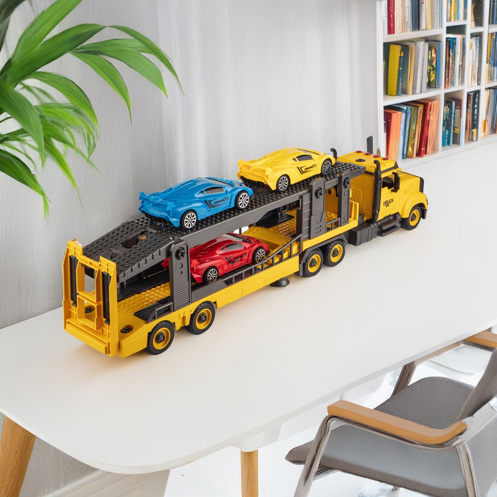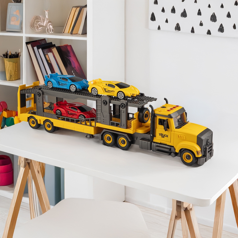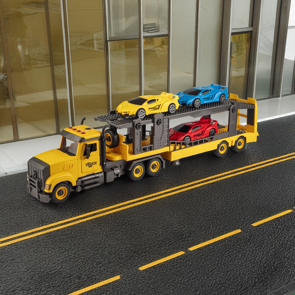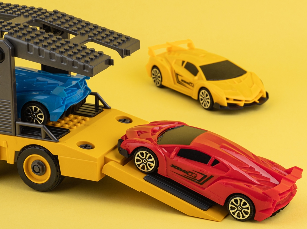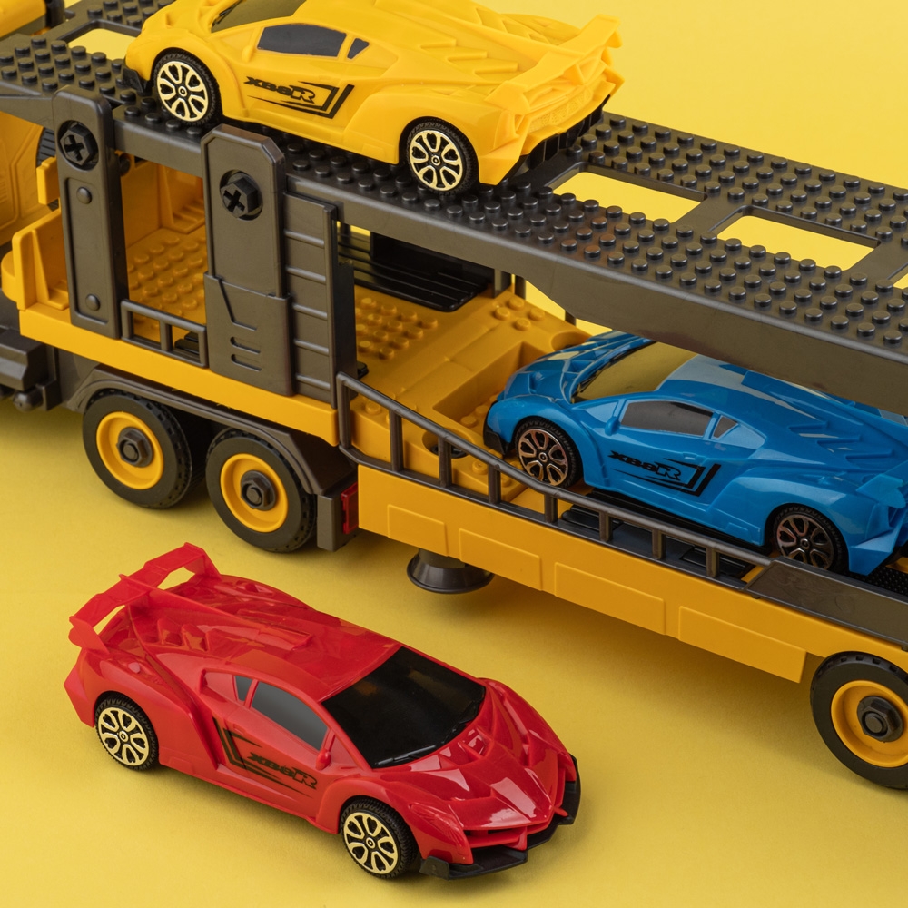Автоконструктор «Тягач з легковими машинами» — ідеальна іграшка для юних автолюбителів, які мріють керувати власним транспортним конвоєм. Інерційний тягач легко рухається вперед, а світлові та звукові ефекти додають грі реалістичності та створюють атмосферу справжньої транспортної операції.