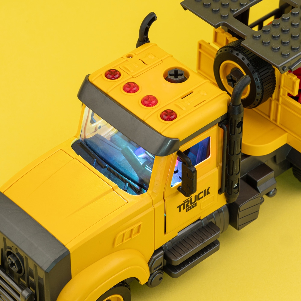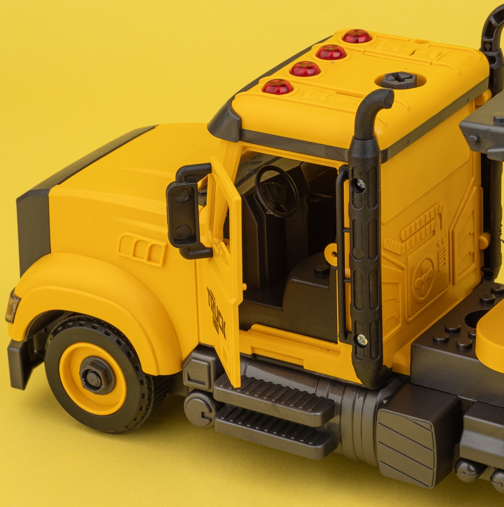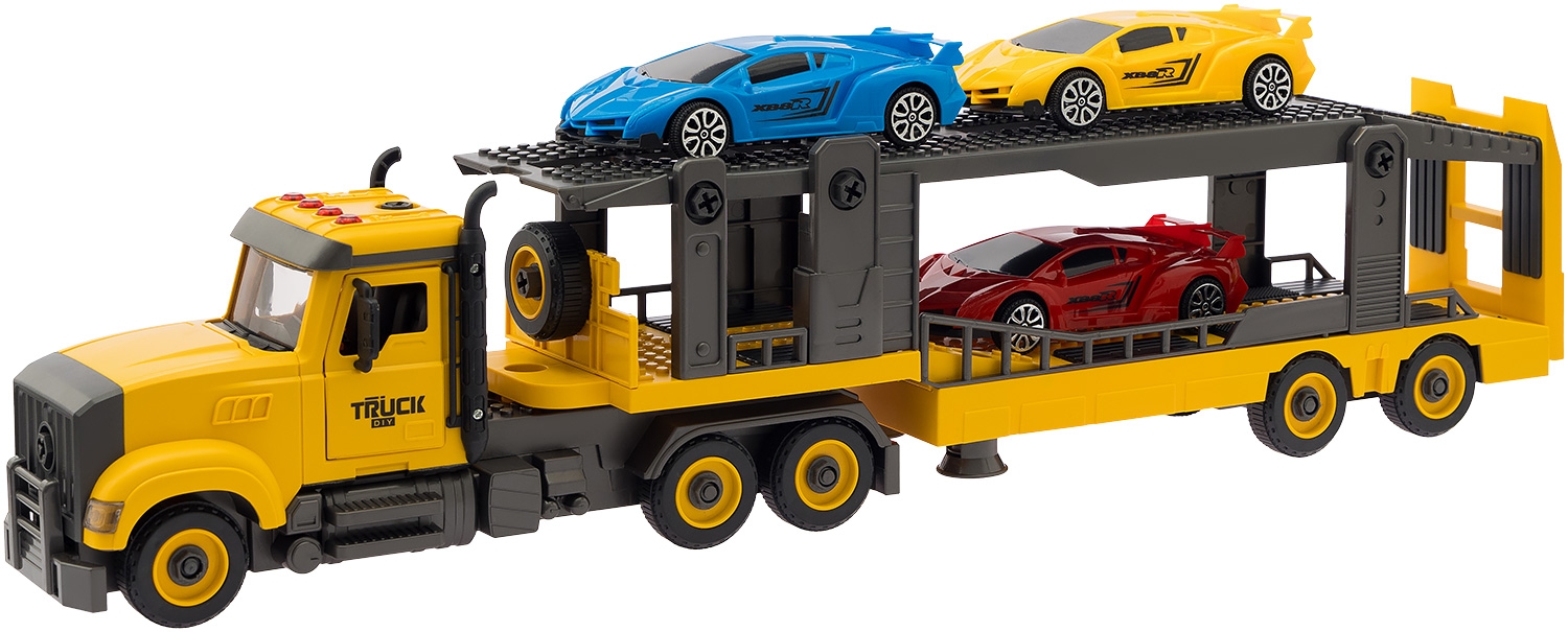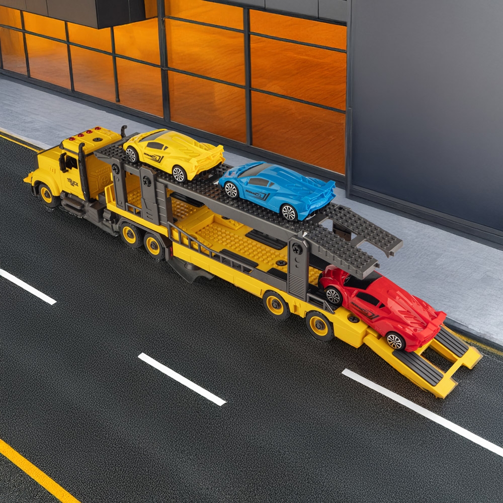 Автоконструктор «Тягач з легковими машинами» — ідеальна іграшка для юних автолюбителів, які мріють керувати власним транспортним конвоєм. Інерційний тягач легко рухається вперед, а світлові та звукові ефекти додають грі реалістичності та створюють атмосферу справжньої транспортної операції.