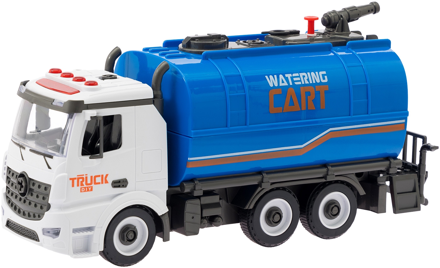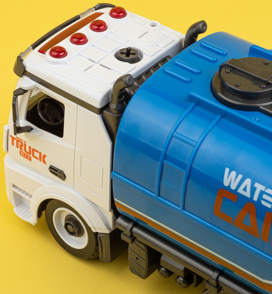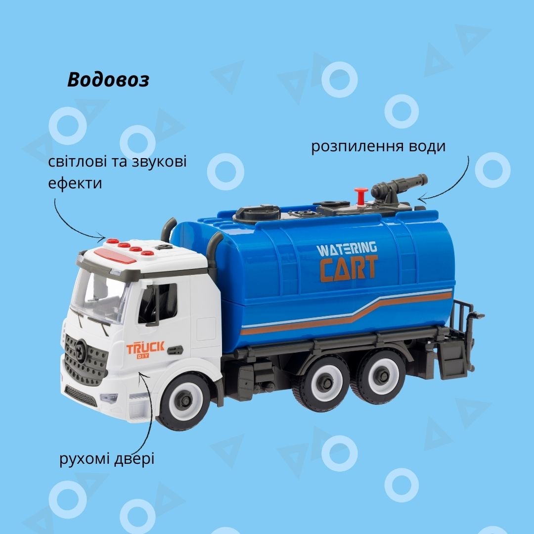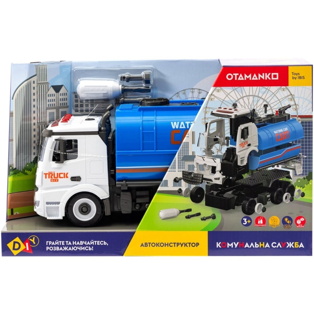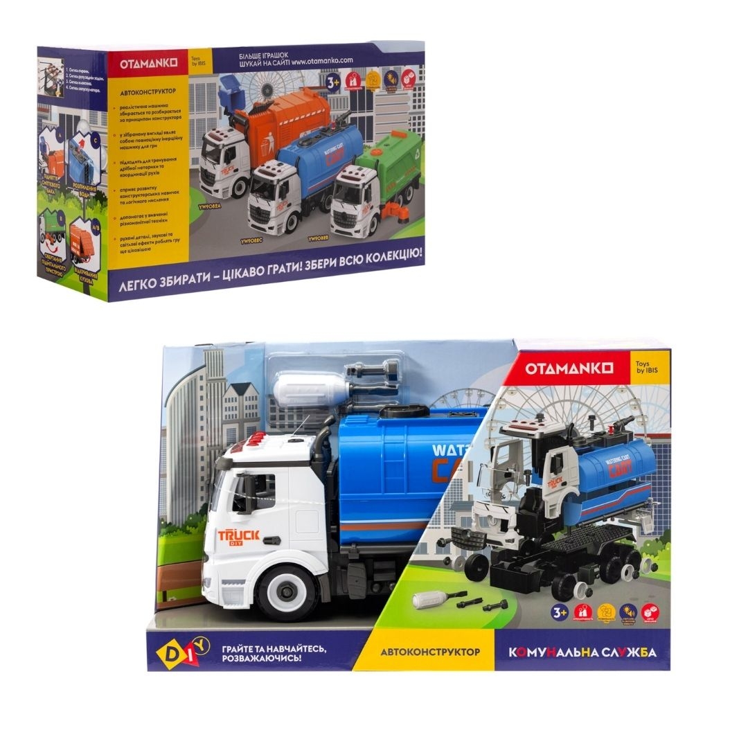 Автоконструктор «Комунальна служба» — водовоз стане чудовою іграшкою для дітей, які цікавляться спецтехнікою та люблять сюжетні ігри. Інерційний механізм забезпечує легкий рух машинки, а світлові та звукові ефекти відтворюють роботу справжньої комунальної техніки.