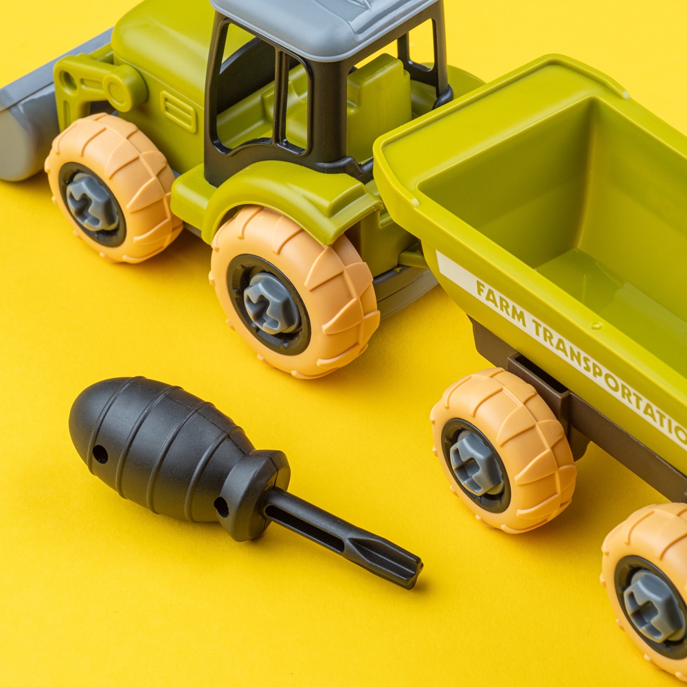 Малюк зможе збирати та розбирати трактор скільки завгодно разів за допомогою викрутки з комплекту, навчаючись працювати з технікою та відчуваючи себе справжнім механіком.