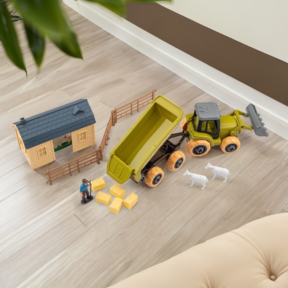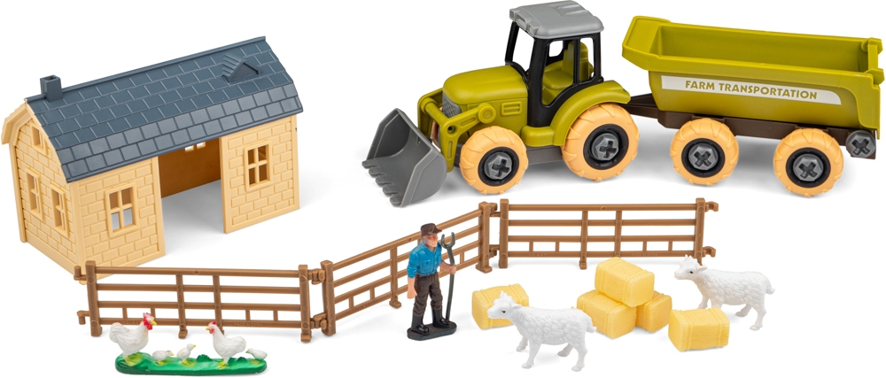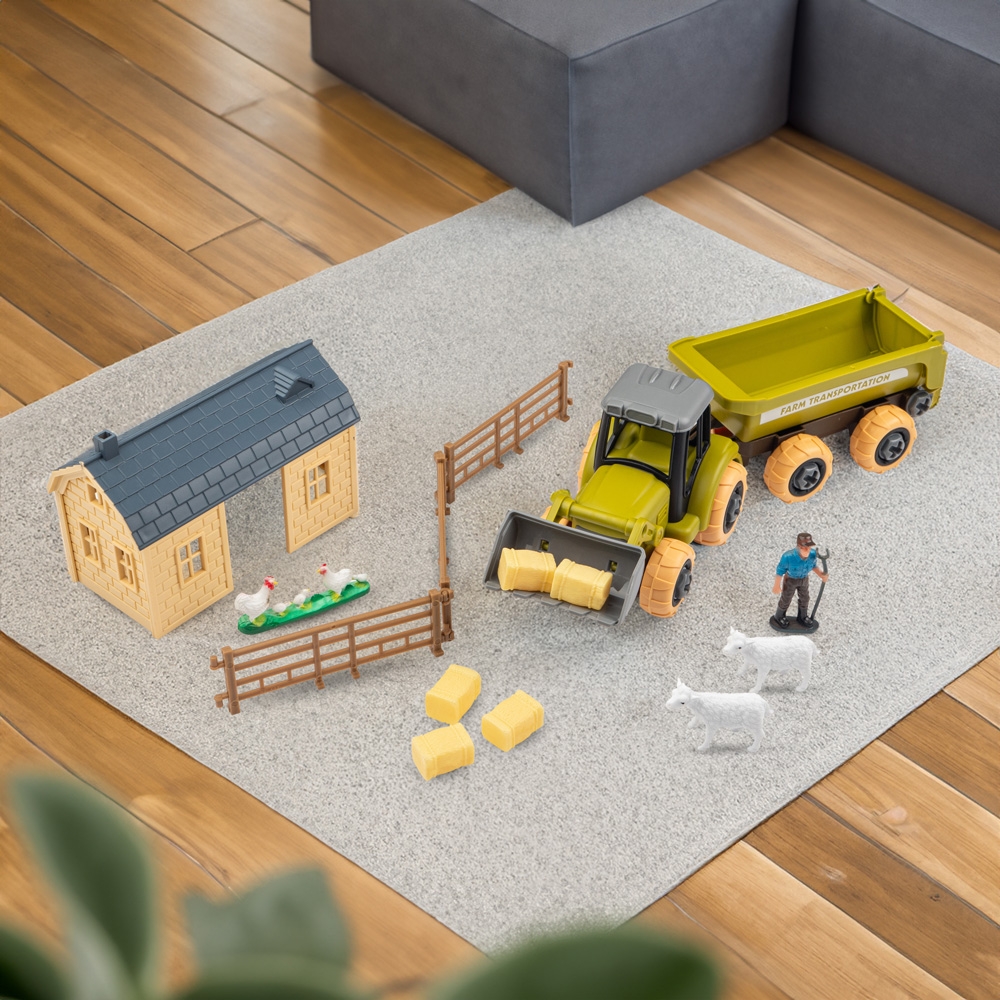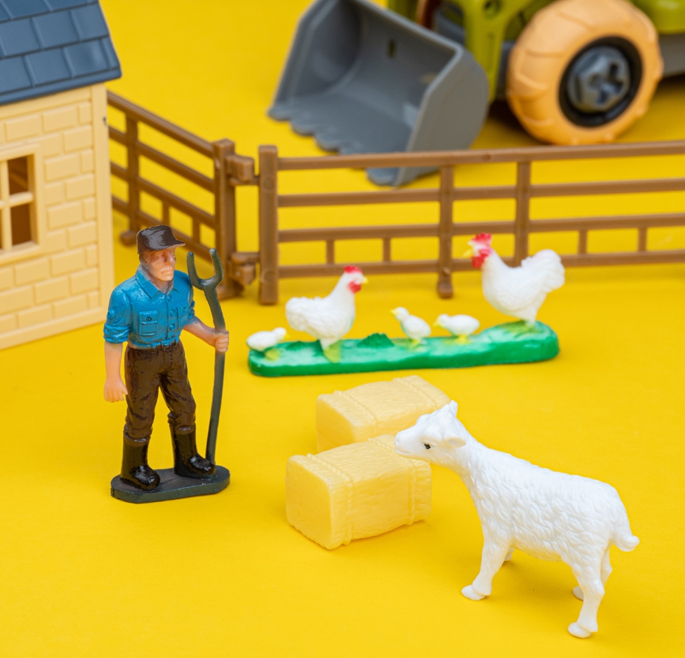 Щоб гра була ще цікавішою, у наборі є загін, фігурки фермера та тварин, а також додаткові аксесуари. Дитина зможе доглядати за тваринами, керувати фермою та вигадувати власні ігрові сценарії. Всі деталі безпечні та мають гладкі краї.