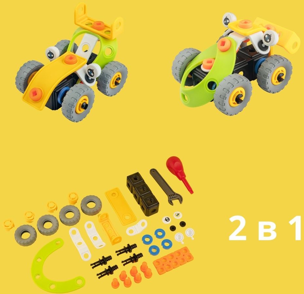 У наборі 48 деталей, з яких можна зібрати дві різні моделі — машинки, вертольоти або інші креативні конструкції. Гнучкі елементи дозволяють змінювати форми деталей, створюючи унікальні моделі та надихаючи на нескінченні ігрові експерименти.