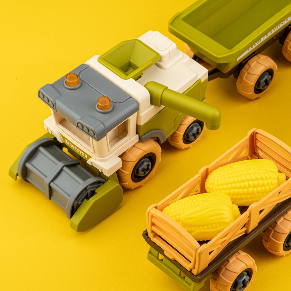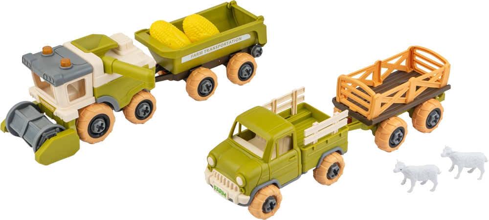 У наборі є все необхідне для справжніх польових робіт: потужний комбайн із двома причепами, велика вантажівка та спеціальна викрутка для збирання і розбирання техніки. Це чудовий спосіб розвивати у малюка дрібну моторику та технічні навички, адже тепер він сам зможе конструювати свої транспортні засоби.