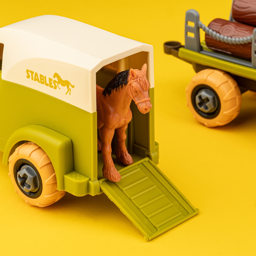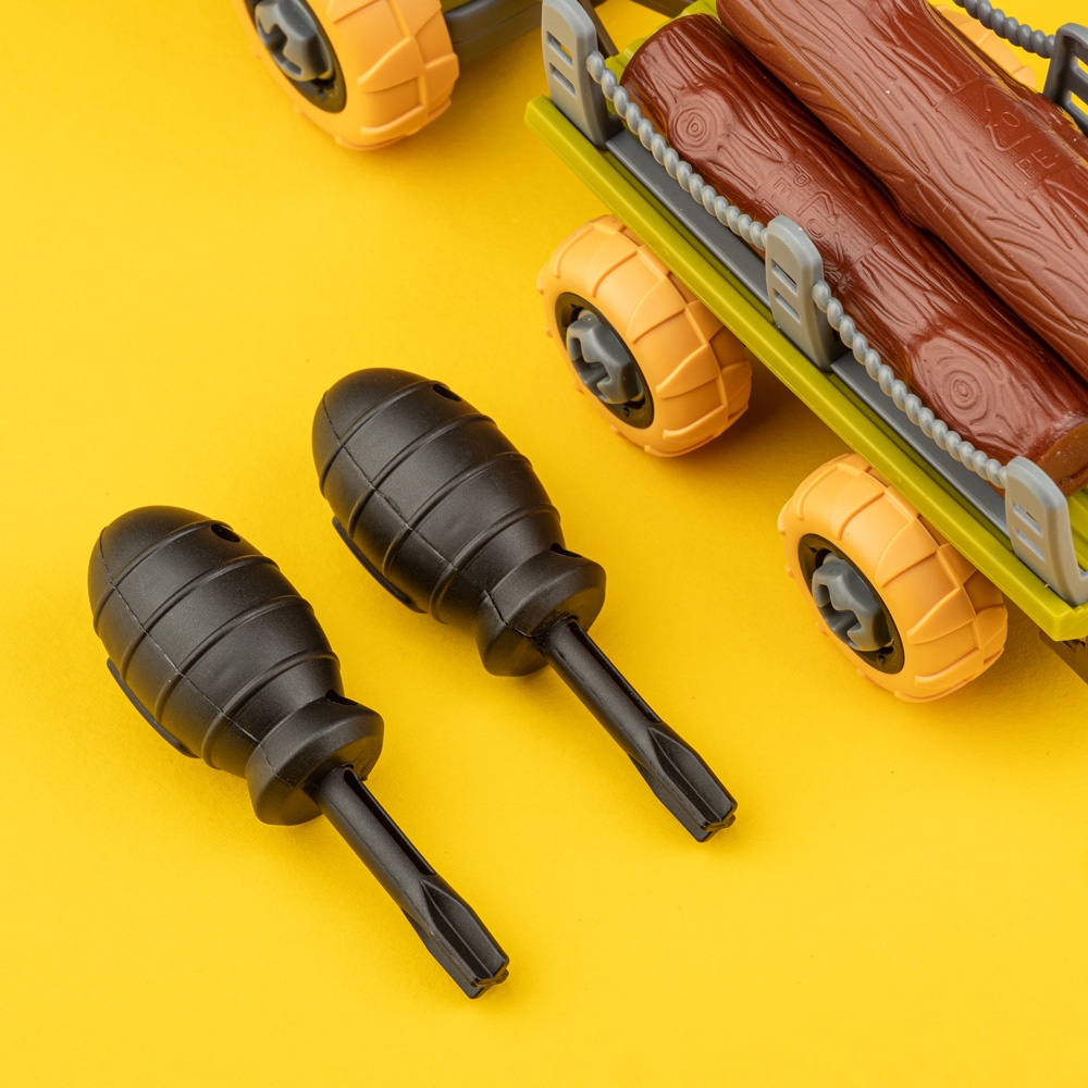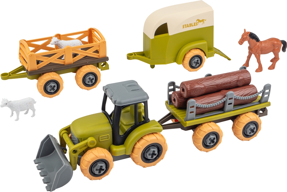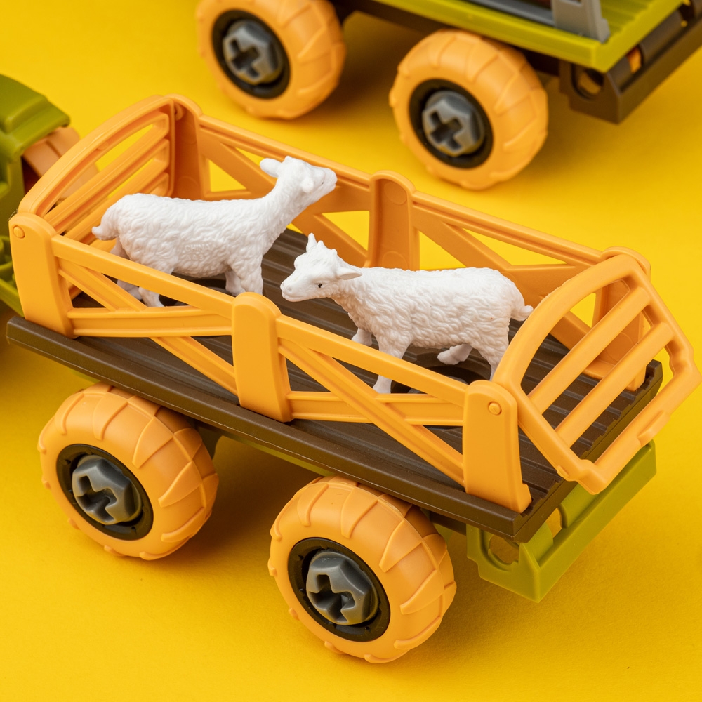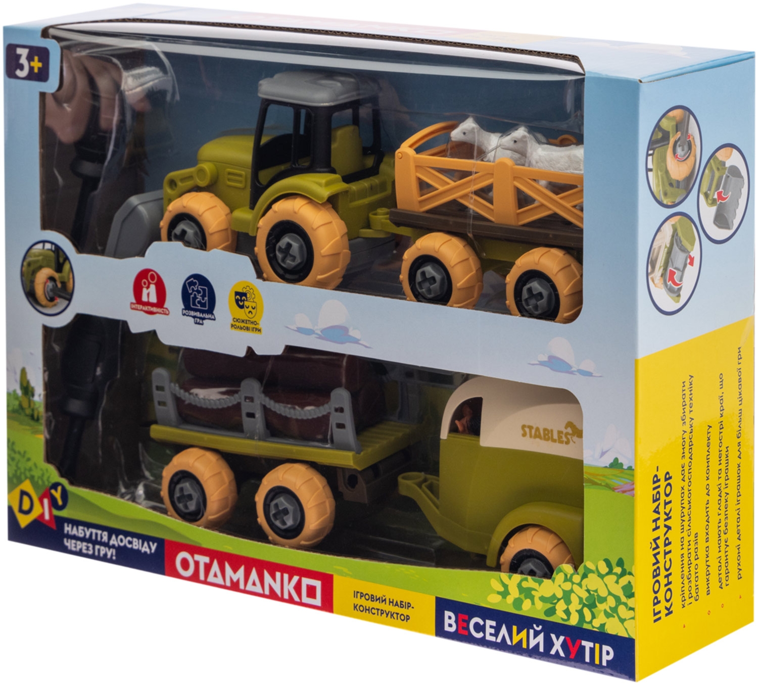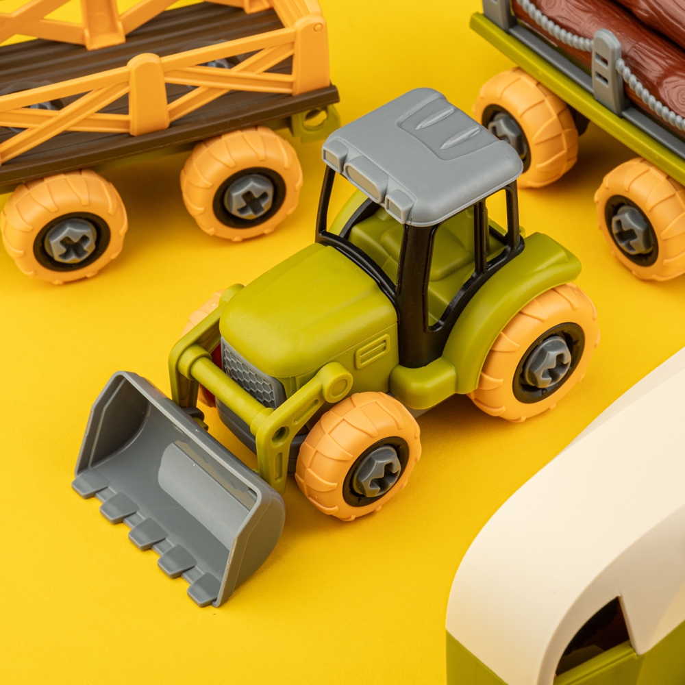 Цей набір дарує дитині можливість не лише грати, а й будувати. У комплекті ви знайдете розбірний трактор з двома причепами та викрутку, що дозволяє малюку самостійно збирати та ремонтувати техніку. Це відмінно тренує моторику та інженерні навички.