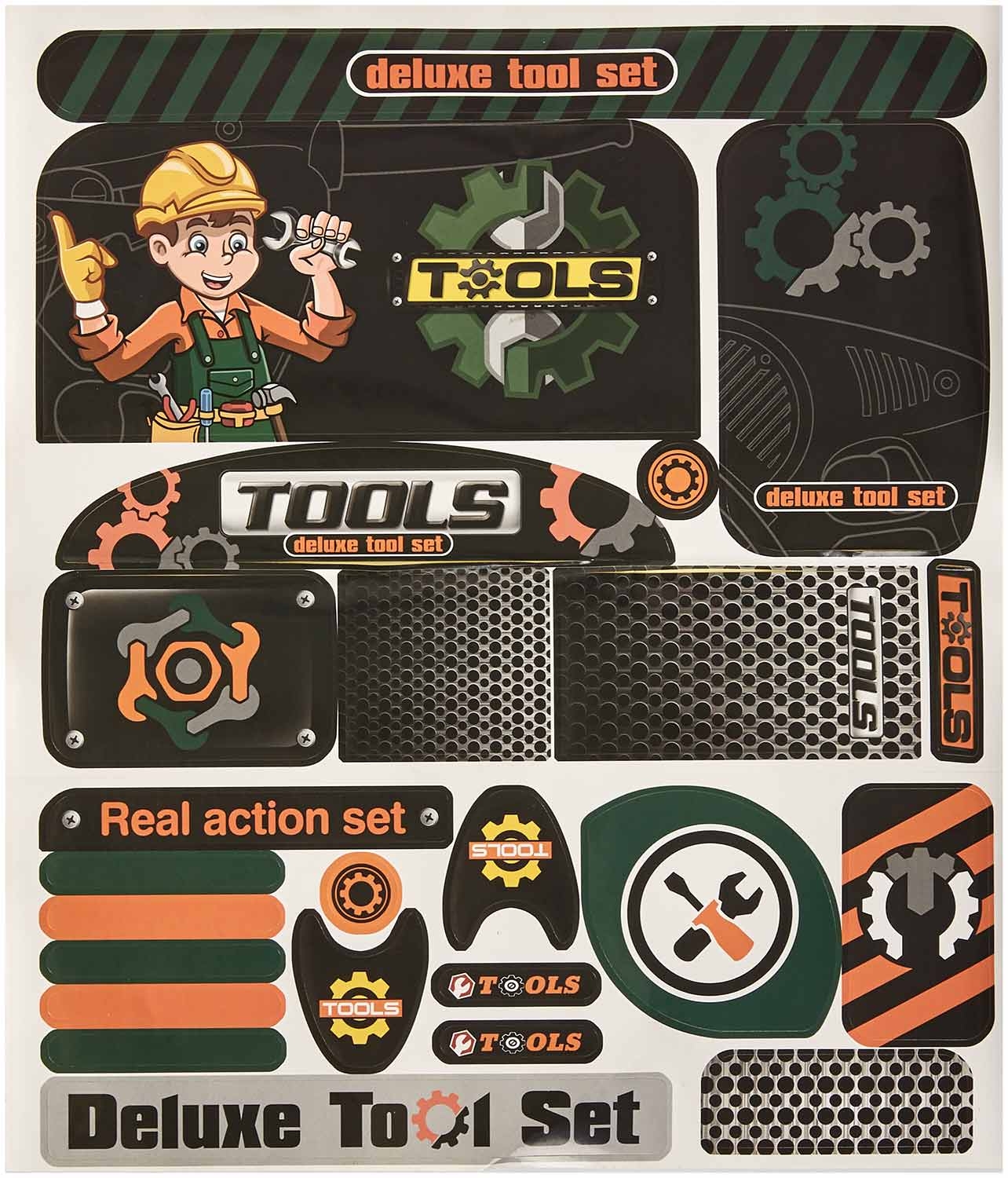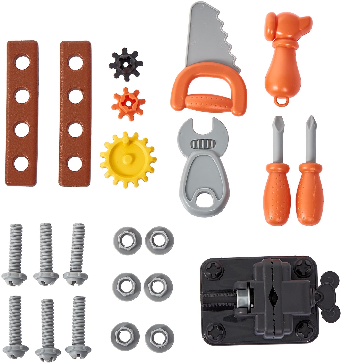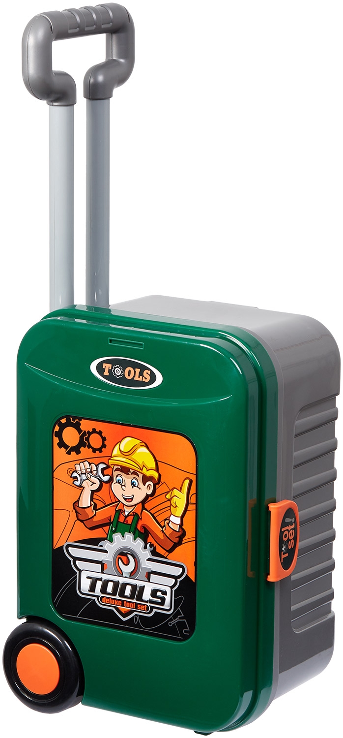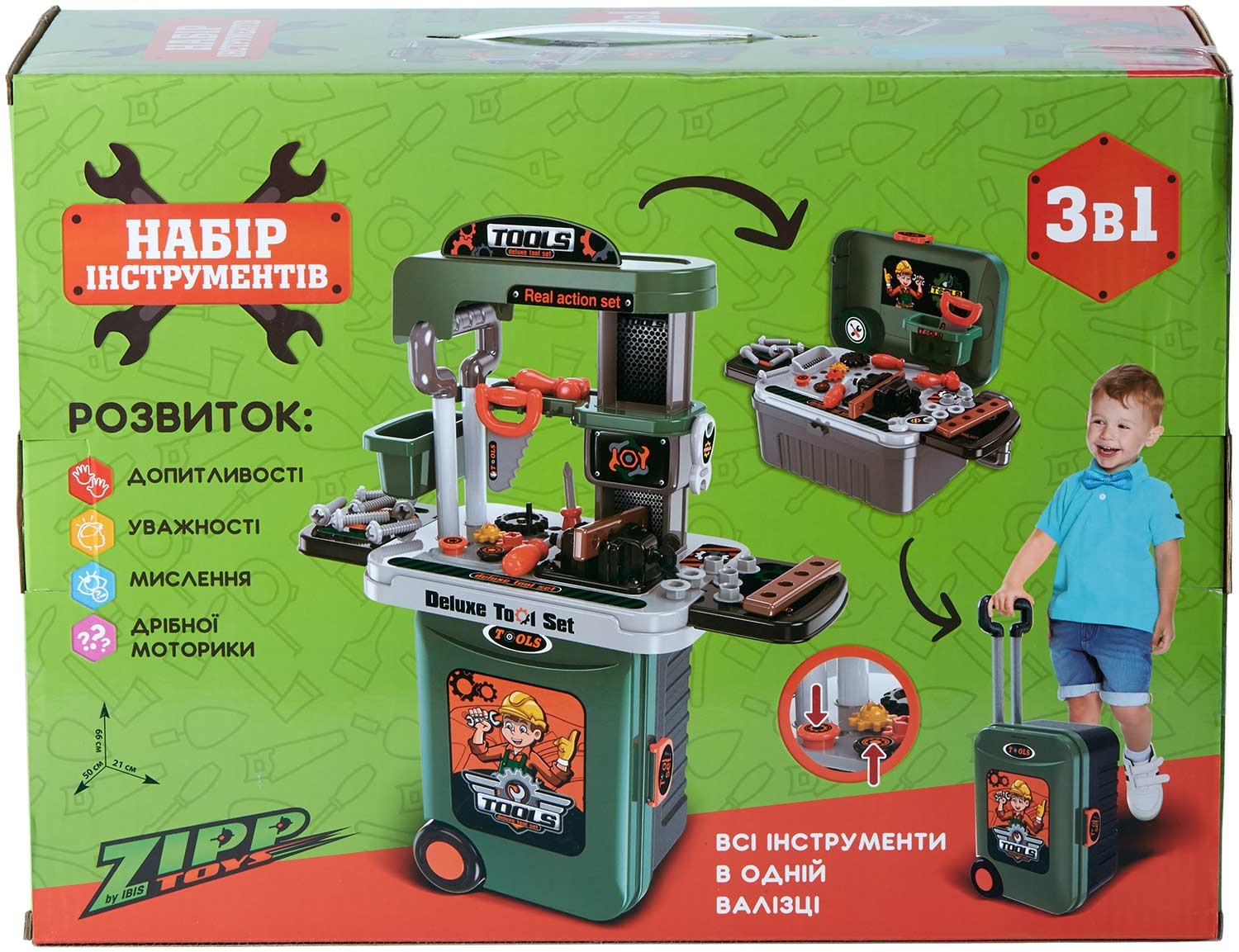 Набір являє собою маленький чемодан із іграшковими інструментами та комплектуючими. Основний матеріал — м’який пластик, усі деталі продумані для безпеки дитини та оточуючих. Гра розвиває моторику, уяву та інтерес до фізичної праці.