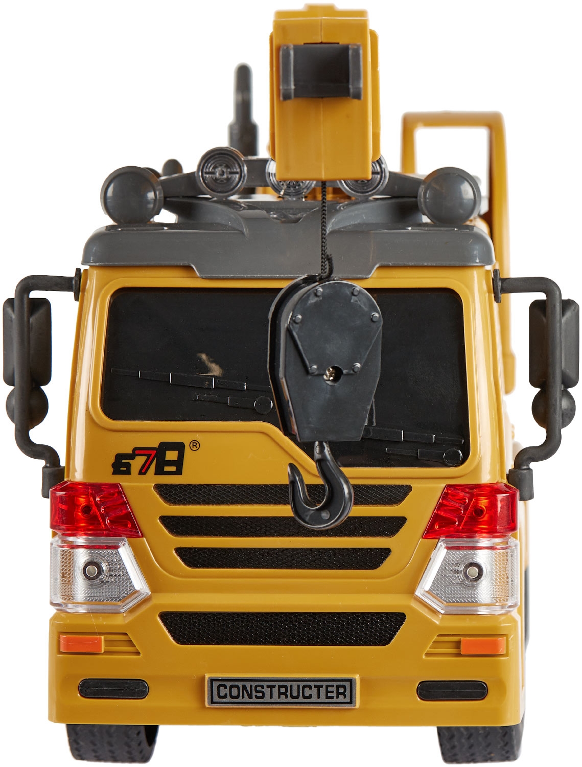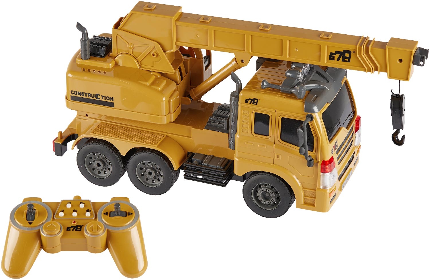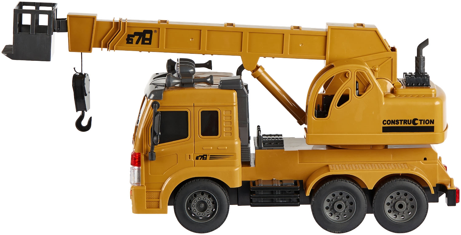 Автокран на радіокеруванні з реалістичною механікою та повним циклом робочих функцій. Джойстик дозволяє керувати рухом машини, роботою стріли та корзини для підйому фігурок, а також світловими і звуковими ефектами. Три пари прогумованих коліс забезпечують рух по рівній та пересіченій місцевості. У комплекті є іграшкове колода для демонстрації роботи крана.