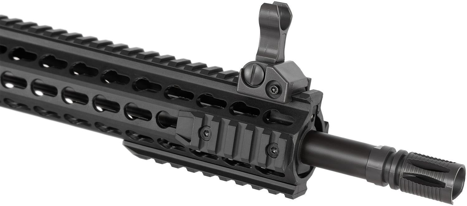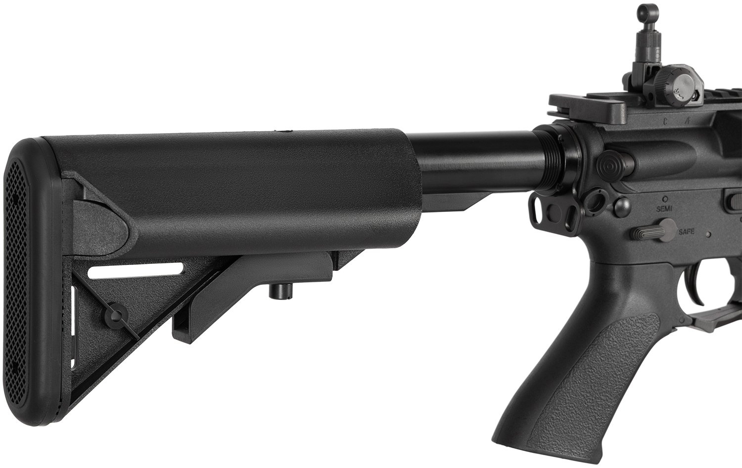 Модель CYMA Sport M4 оснащена регульованою системою Hop-Up, яка дозволяє налаштувати траєкторію польоту кульок для підвищення точності на різних відстанях.