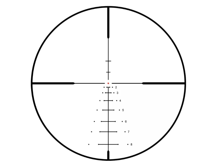 Сітка DOA-LRH800, розміщена у другій фокальній площині, має підсвічувану центральну точку для швидкого наведення. Її розмітка дозволяє робити поправки на вітер і траєкторію кулі без необхідності обертати барабани.