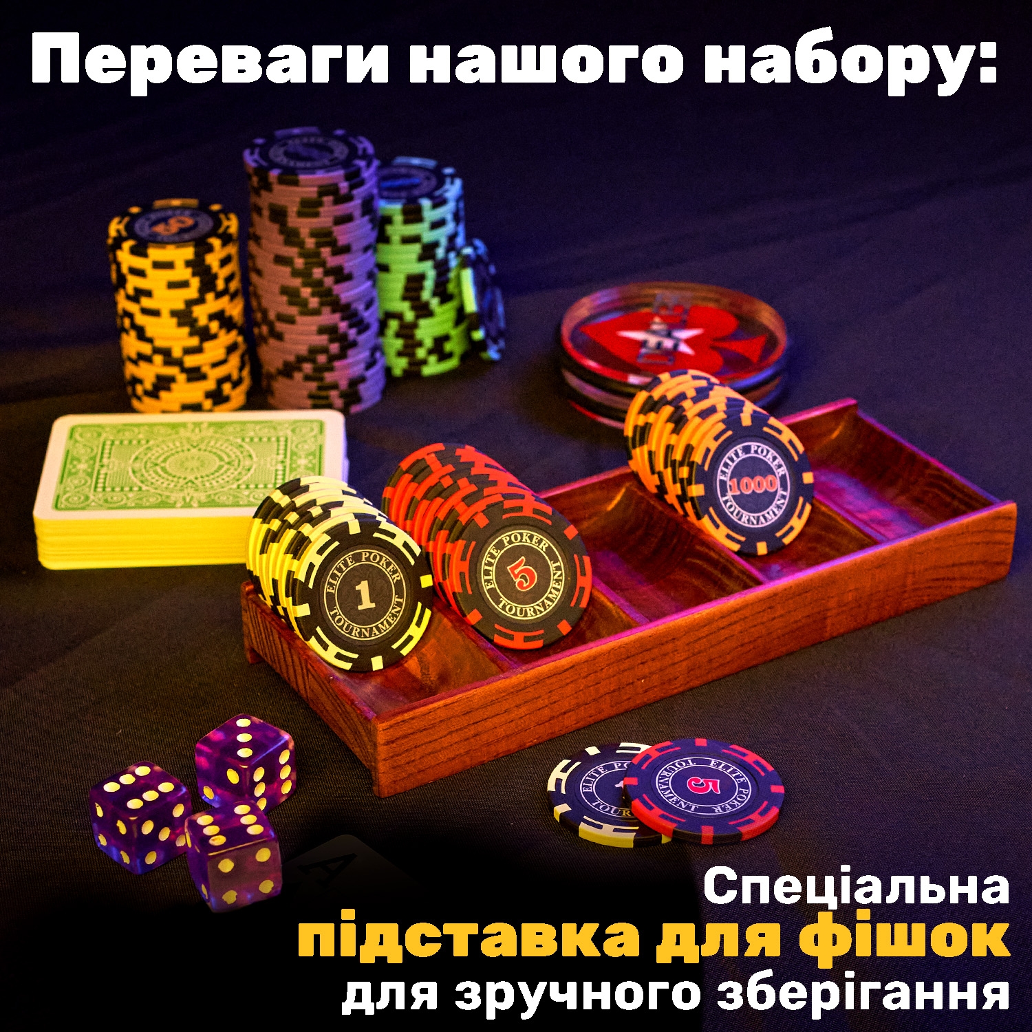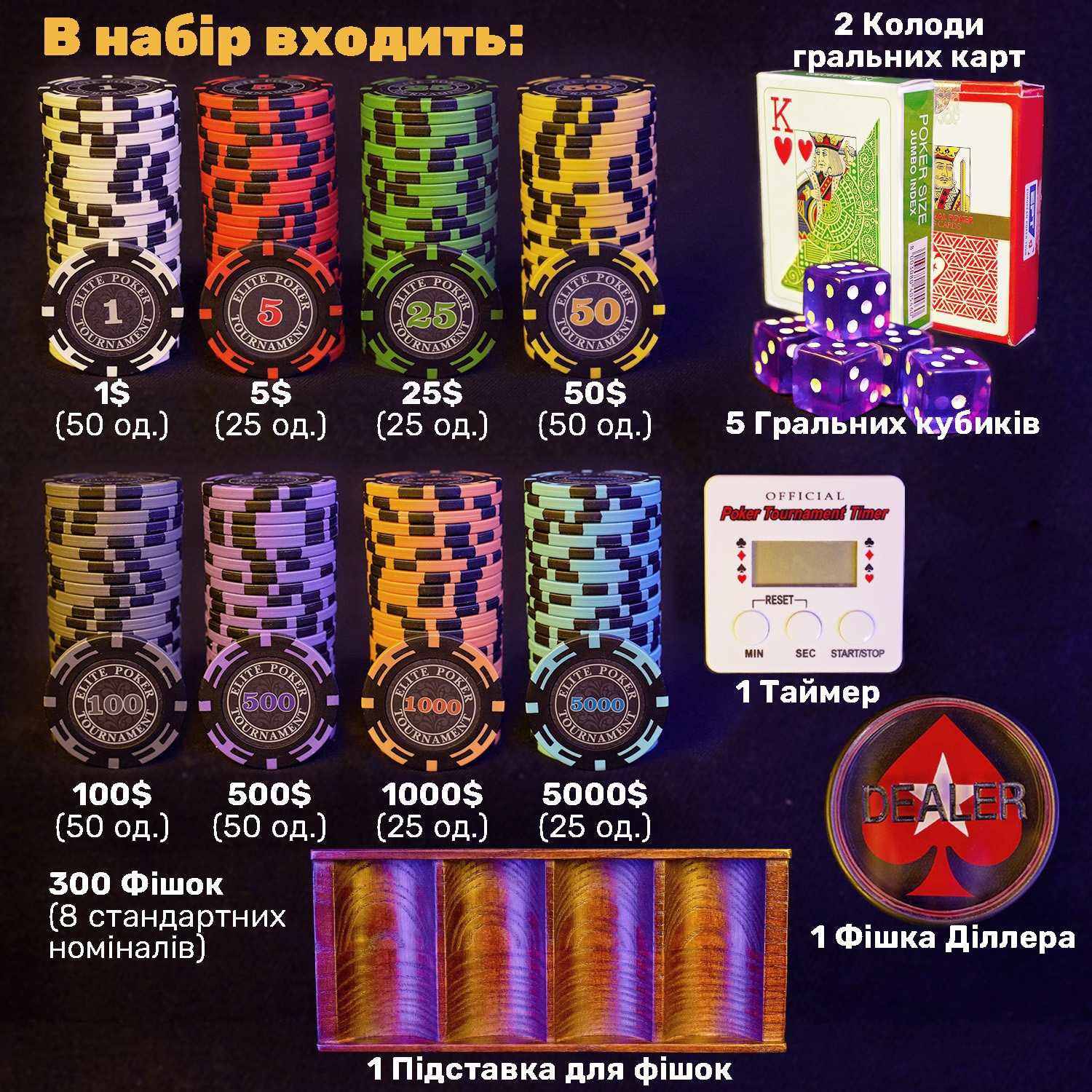 Набір підійде для різних варіантів покеру та інших настільних ігор. Усе зібрано разом, нічого окремо докуповувати не потрібно.
