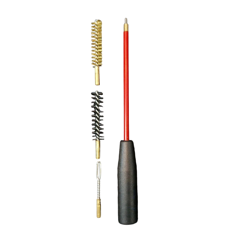 Практичний набір для регулярного обслуговування пістолетів 9 мм. Секційна або збірна конструкція шомпола (червоний стрижень із ергономічною пластиковою ручкою) забезпечує зручну роботу і транспортування. Латунна йорж-щітка акуратно знімає свинцеві й вугільні відкладення, жорстка щітка — для стійких забруднень, петля дозволяє протягувати патчі/серветки, а моп (ватний тампон) дає чисту поліровку і нанесення захисного масла. Поставляється у прозорому поліетиленовому пакеті з маркуванням калібру.