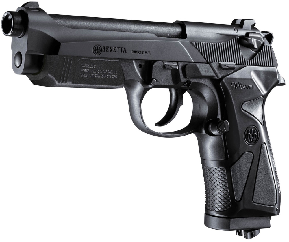 Umarex Beretta 90 TWO выполнен из металла и прочного пластика и работает от 12-граммового баллона CO2, который размещается в магазине.