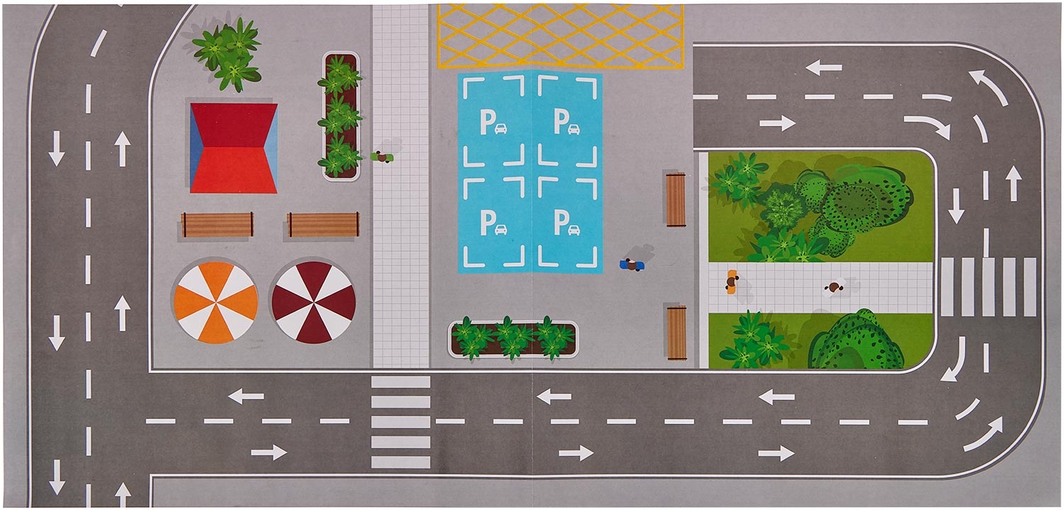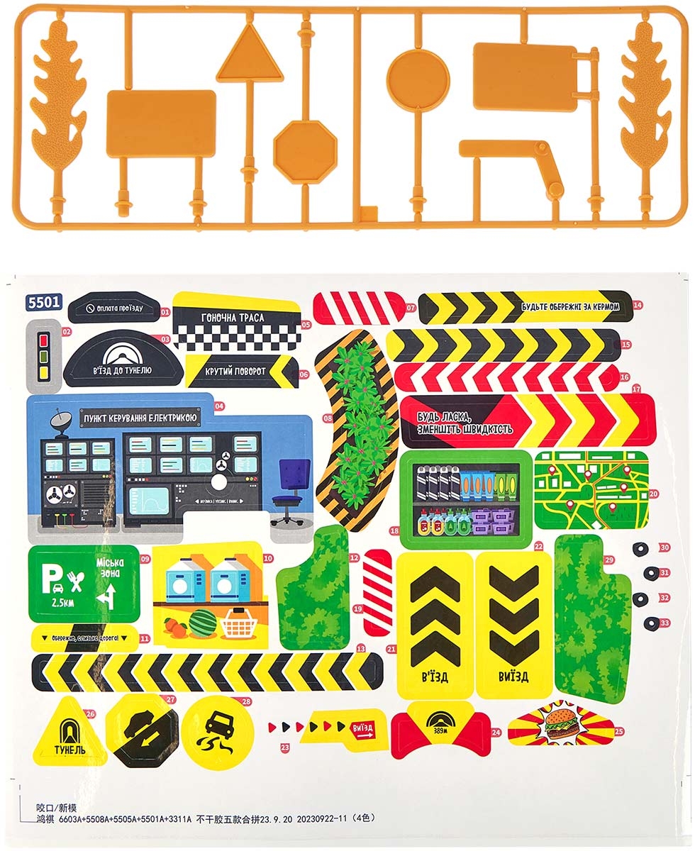 Яркий желтый набор позволит ребенку почувствовать себя инженером: мосты, тоннели, участки с ремонтом и предупреждающие знаки помогут построить любую эстакаду или трассу. В наборе есть локомотив на двух батарейках типа ААА, который перемещает весь состав; в вагоне поднимается крыша.