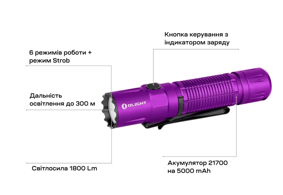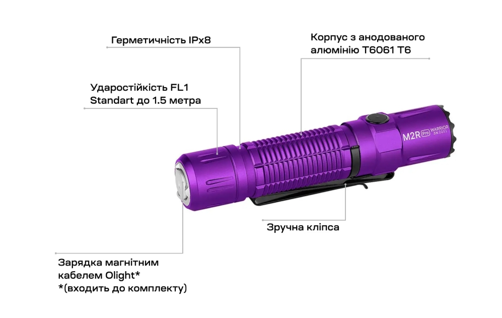 Заказать Фонарь Olight M2R Pro Purple вы можете на сайте NA MUSHKE! или по телефону у наших менеджеров. Мы осуществляем доставку товаров Olight по всей территории Украины (кроме временно оккупированных): Киев, Харьков, Одесса, Днепр, Запорожье, Львов, Кривой Рог, Николаев, Винница, Херсон, Полтава, Чернигов, Черкассы, Житомир, Сумы, Хмельницкий, Черновцы, Ровно, Каменское, Кропивницкий, Ивано-Франковск, Кременчуг, Тернополь, Луцк, Белая Церковь, Краматорск, Мелитополь, Никополь, Славянск, Ужгород, Каменец-Подольский, Бровары, Конотоп, Умань, Мукачево, Александрия, Дрогобыч, Нежин, Измаил, Новомосковск, Ковель, Смела, Червоноград, Калуш, Первомайськ, Коростень, Коломыя, Борисполь, Стрый, Нововолынск, Горишние Плавни, Изюм, Белгород-Днестровский, Ахтырка, Марганец, Фастов, Лубны, Жёлтые Воды, Светловодск, Ирпень, Шепетовка, Ромны, Миргород, Подольск, Южноукраинск, Владимир-Волынский, Дубно, Вишнёвое.