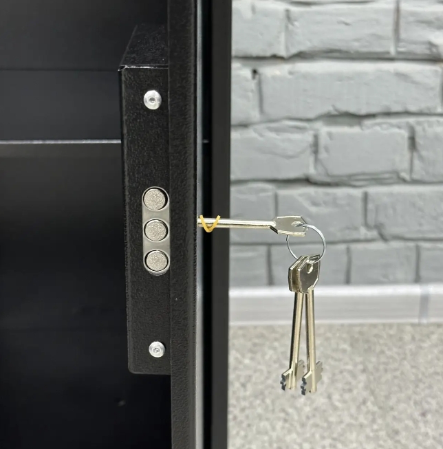 Надежный ключевой замок сувальдного типа с 3 ригелями диаметром 10 мм (горизонтальное отпирание) обезопасит ваши документы или ценности от посторонних.