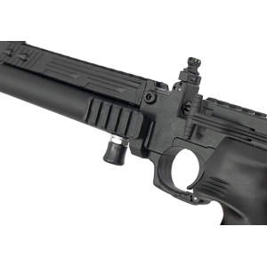 Источником энергии пистолета служит подствольный резервуар высокого давления объемом 40 см3. Стальной ствол пистолета длиной 200 мм способен обеспечить оптимальную кучность на дистанции до 25 метров.